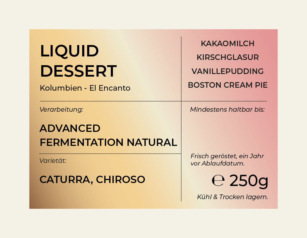 Liquid Dessert ist ein extrem süßer, cremiger und runder Kaffee aus Kolumbien, gemacht für alle, die ihr Dessert am liebsten trinken – flüssiges Dessert, pures Vergnügen.